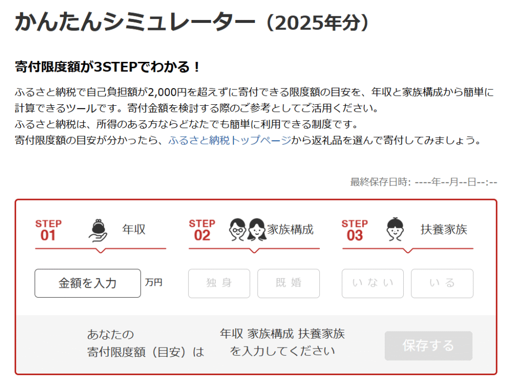 楽天ユーザーなら「楽天ふるさと納税」で、年収、家族構成、扶養家族の3ステップ入力で寄付金額が分かるので、簡単に目安を調べることができるよ✨